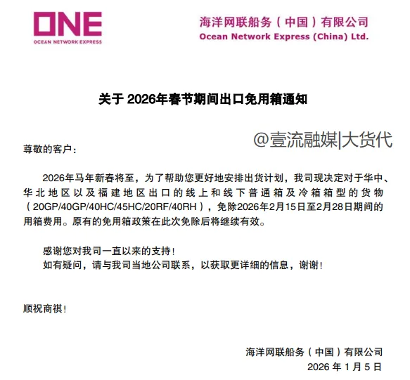 根据ONE《关于2026年春节期间出口免用箱通知》显示,