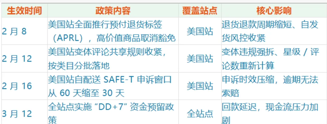 为帮助卖家快速掌握新政核心信息,以下整理了各政策的生效时间、核心内容、覆盖站点及直接影响,便于卖家按时间节点推进准备工作: