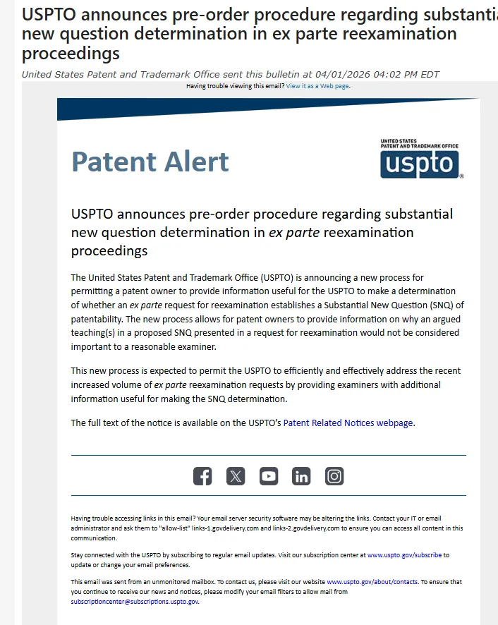 美国时间4月1日,美国专利商标局发布通知,公布单方再审程序中实质性新问题判定的预先提交程序。