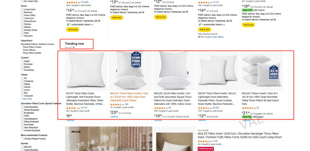 比如在搜产品关键词throw pillow的时候,搜索页面第三行就有对应的推荐流量的板块,比推一些自然位置和广告位置会香的多。