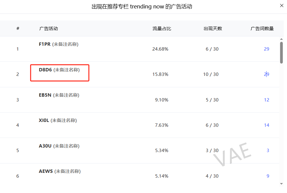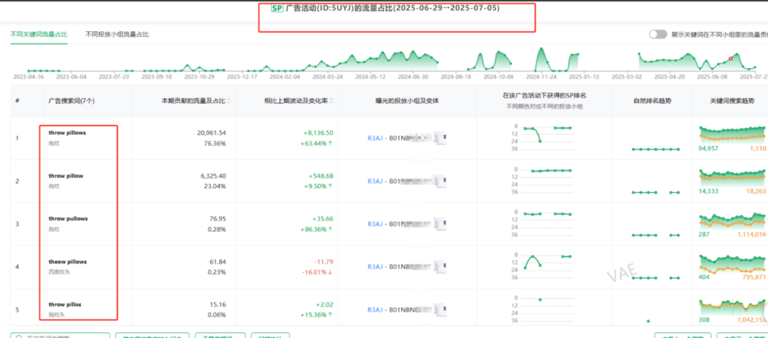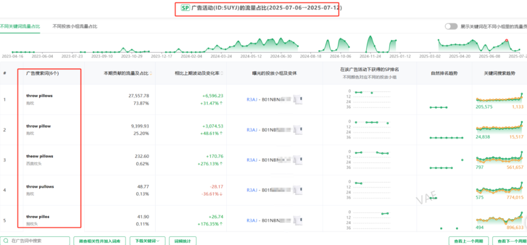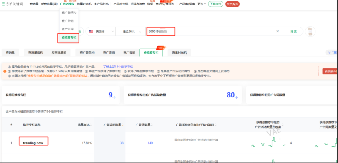 5. 哪些广告活动获得了这些推荐流量专栏(PS:因为竞品的广告框架,用插件也基本可以扒得干净,所以相当竞品的广告活动也是透明的),这些广告活动推荐流量贡献的流量占比、可以触达哪些推荐流量专栏,触发关键词的数量和触发天数占比(SIF也可以直接跳转到对应的广告活动)