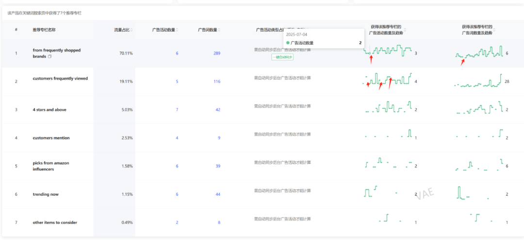 可以查看我们产品/竞品在某个词下的推荐流量专栏的坑位展示情况,可以整个产品的流量大盘和具体广告活动查看到出现频率。假设如果能够做到一个月能连续出现,那么这个词的推荐流量专栏的垄断率还是比较高的。