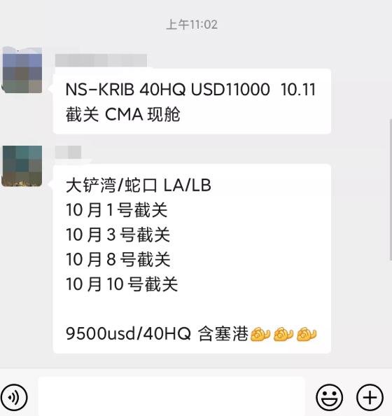 某国际物流网友交流群今天的信息也显示,华南到欧美运费均呈现下跌趋势,其中十月份从蛇口去往洛杉矶(LA)和长滩(LB)运费更是跌破1万美元这个市场心理关口,直接杀到9500美元一线!