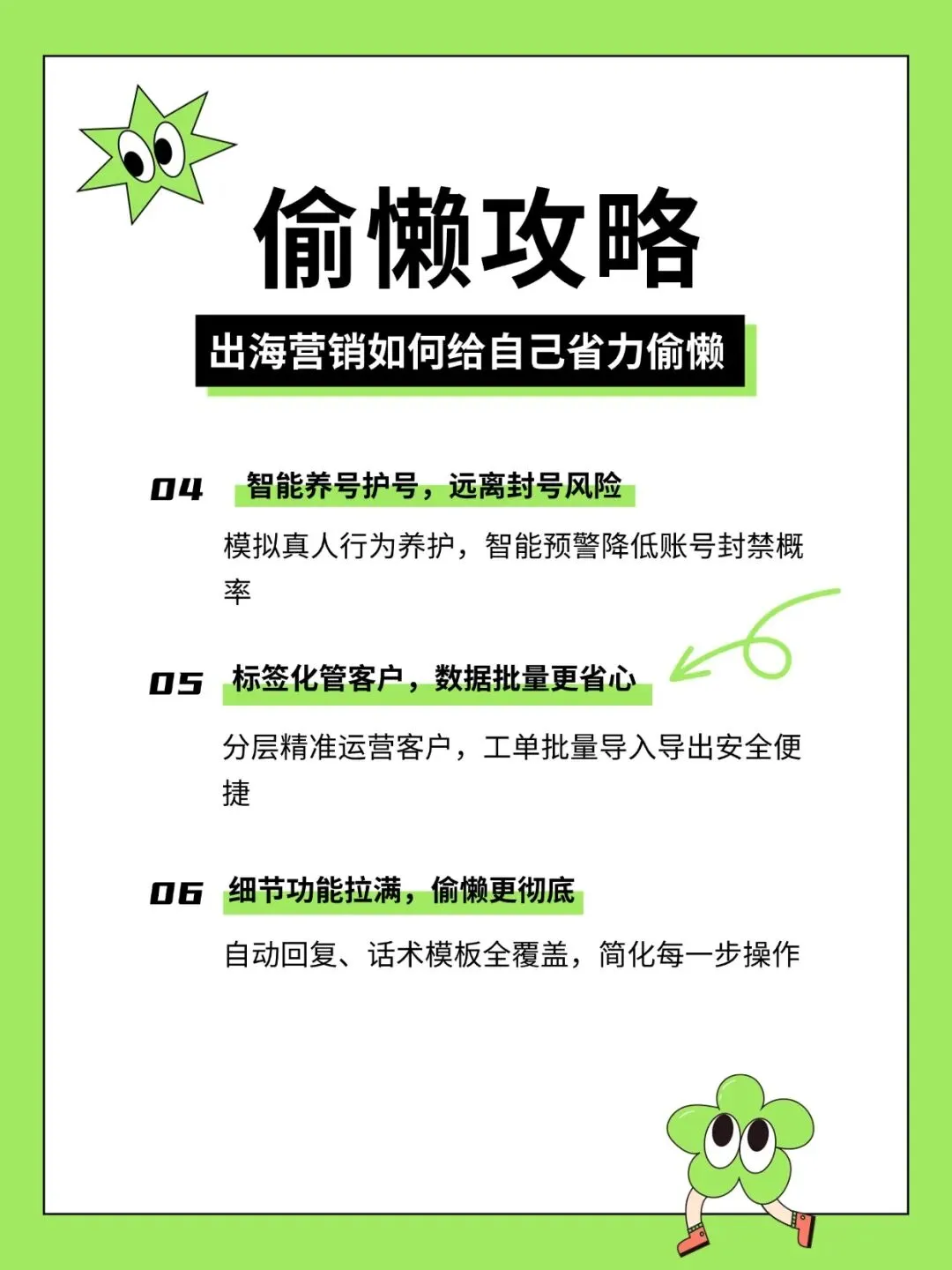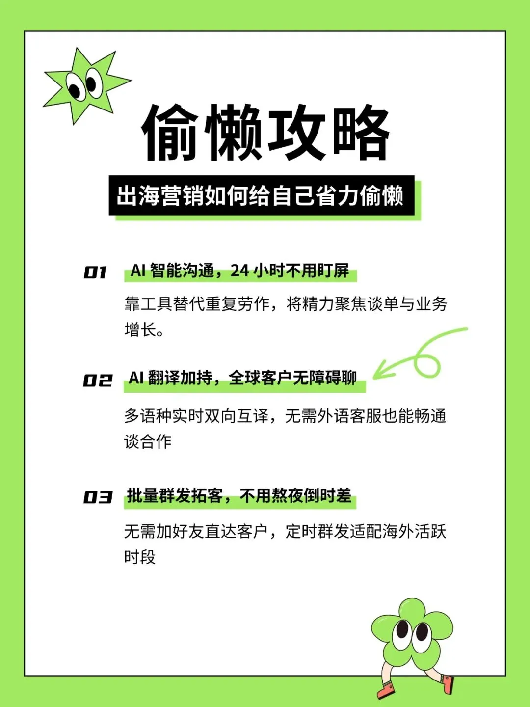 其实这里说的 “偷懒”,根本不是懒,而是用对工具、省对力气 —— 把机械重复的活儿交给 AI 和系统,咱们把精力放在更重要的事儿上:跟客户深度沟通、分析市场趋势、拓展新渠道。现在出海赛道竞争这么激烈,效率就是竞争力,光靠苦干早就不够了。