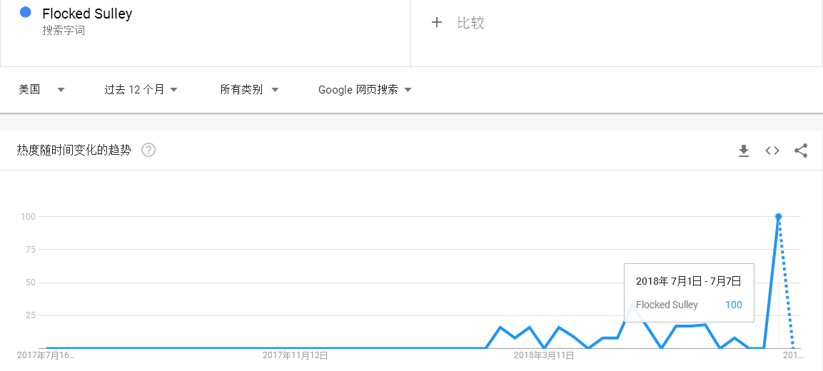 在谷歌趋势上,Flocked Sulley也在7月初在美国迎来搜索高峰,其相关词汇“monsters inc sulley”也成为搜索热词,热度上升: