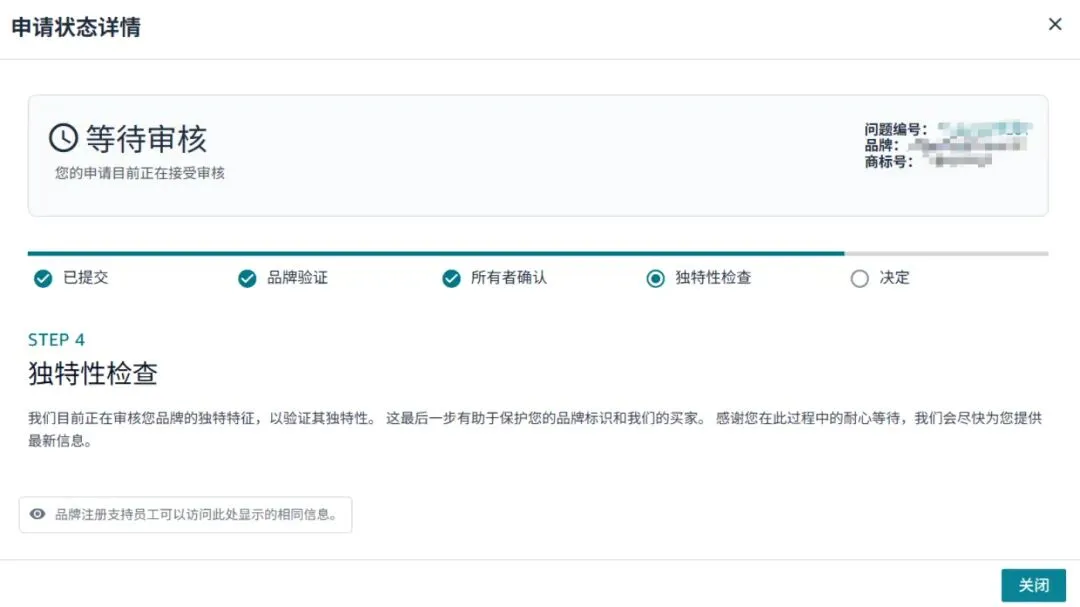 亚马逊品牌备案后台流程节点已更新,有:[已提交一品牌验证一所有者确认一独特性检查一最终决定]五个阶段。