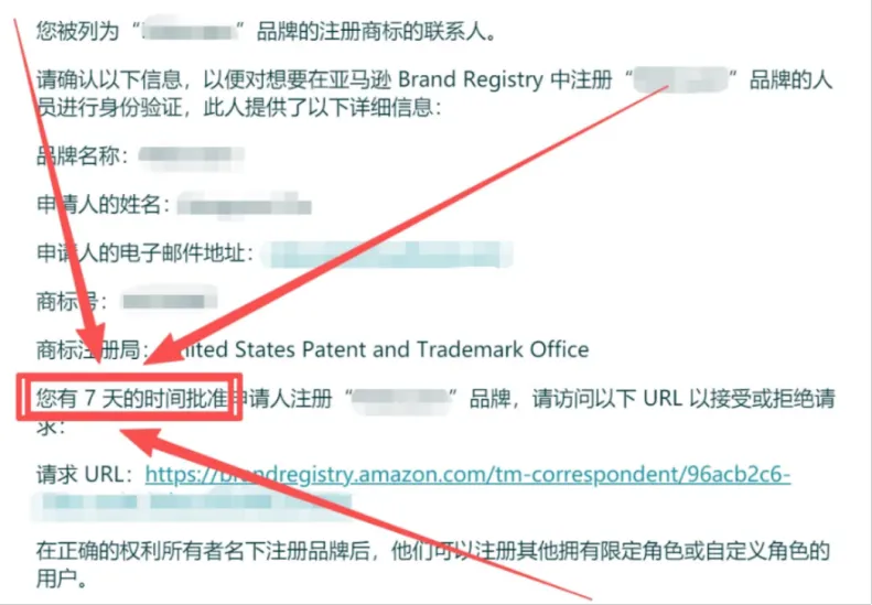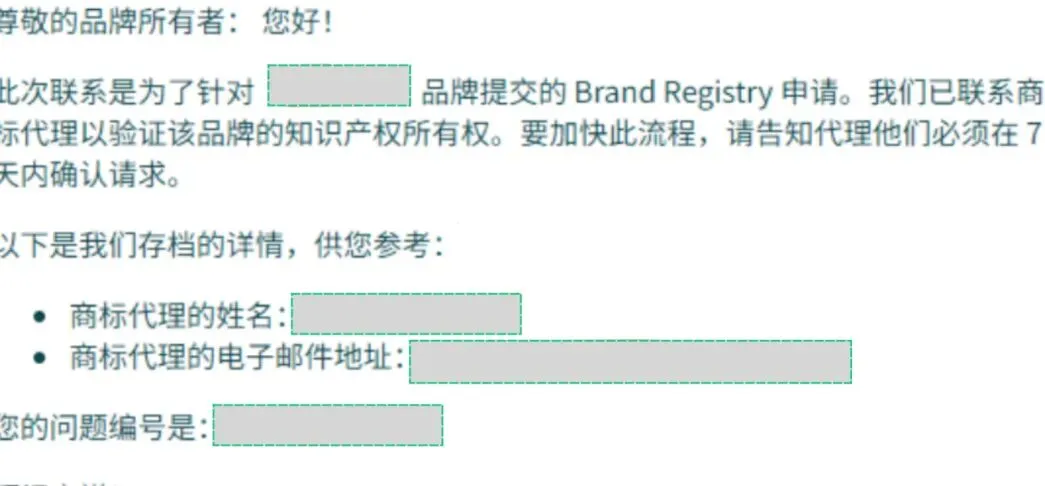 新流程下,卖家仅会收到亚马逊邮件提示:“我们已联系商标代理以验证该品牌的知识产权所有权。告知代理他们必须在7天内确认请求。”