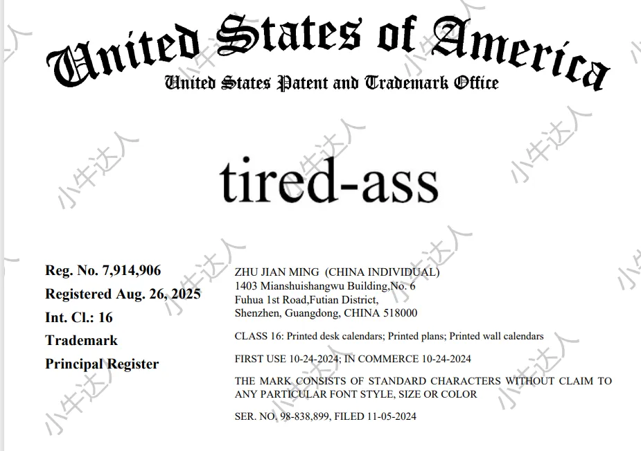 原告是我国卖家,名下注册了一款“TIRED-ASS” 的日历产品
