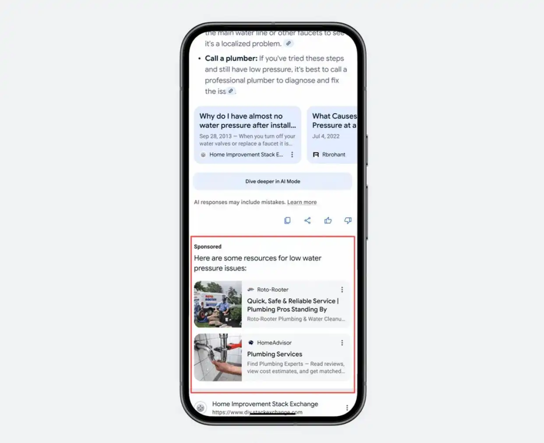 据了解,当用户进行对话式搜索(例如提问“水压低该如何解决”)时,AI生成的答案旁会直接展示诸如水管维修等相关服务的广告。这一变化拓展了情境化、个性化广告在搜索结果中的呈现方式,进一步融合了广告与AI生成内容。