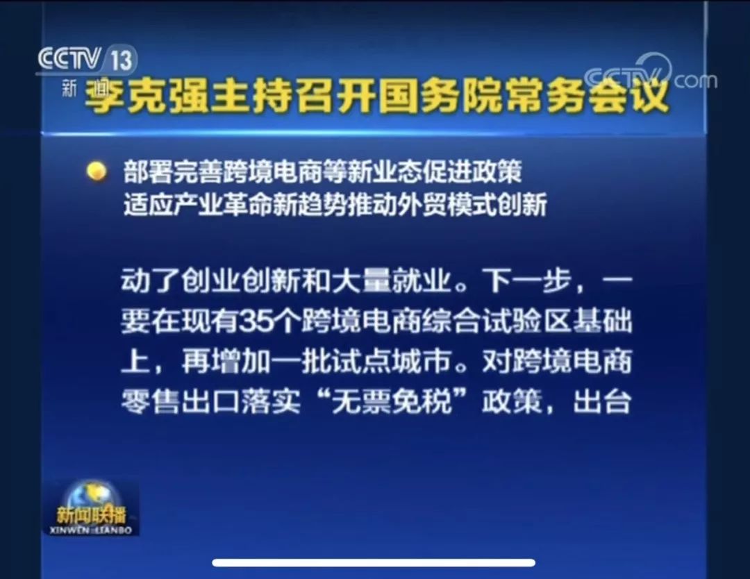 跨境小伙伴值得纪念的日子!国务院总理李克强主持召开国务院常务会议,会议强调指出:部署完善跨境电商等新业态促进政策,适应产业革命新趋势推动外贸模式创新,并在会议中指出对跨境出口电商“无票免征”“出台所得税核定征收办法”两项重大政策。这两项政策如果出台,将深远地积极地影响跨境电商行业的发展,给跨境电商行业走向规范发展带了光芒万丈的曙光!