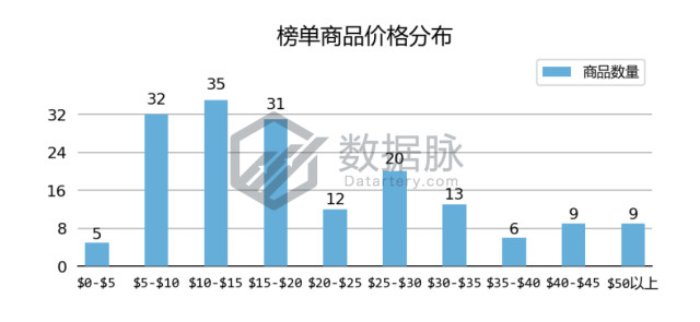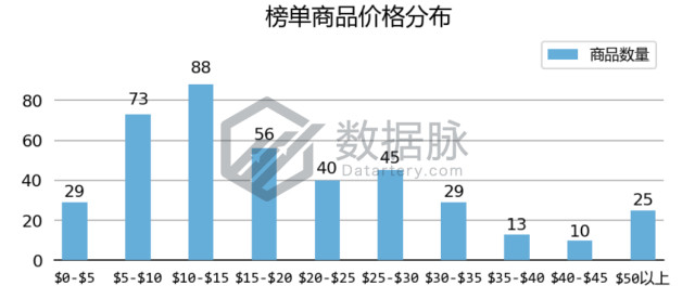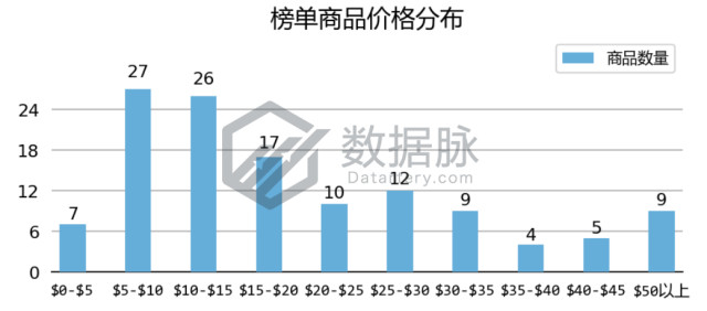 上周 Pet Supplies 品类 Best Seller 榜单商品最高价$79.99, 最低价$0.75,平均价格$21.94。骆探长(shujumai.com)发现,在上榜的商品中, 较多的上榜商品定价于$5.00-$15.00,其中有21.43%的上榜商品位于$5.00-$10.00该价格段,另有20.63%的上榜商品定价在$10.00-$15.00价格段。此外骆探长(shujumai.com)发现,在高价格段,该周共有9款上榜商品定价超过$50.00,占上榜商品总数的7.14%。相较于上期分析,该周进入Best Sellers榜单的商品整体价格略有下降,低价商品的榜单竞争力有所抬升。