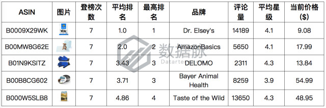 与此同时,来自亚马逊自营品牌AmazonBasics的老牌宠物狗尿垫产品也以2.00的平均排名成绩在一周中完美捍卫了榜单第二的位置。