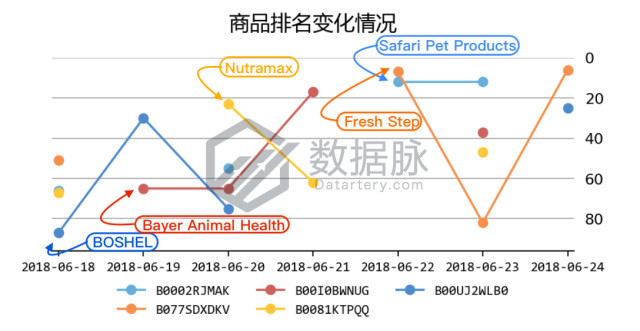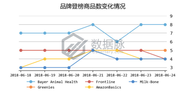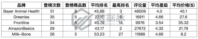 可以看到,在上周Pet Supplies品类的Best Seller榜单中, 宠物卫生用品品牌Bayer Animal Health的榜单统治力尤为突出,凭借每日上榜6款商品的完美成绩,成功取得了一周登榜总次数51次,再次夺得品牌综合排名首位。于此同时,骆探长(shujumai.com)注意到,几个宠物用品大品牌——Greenies、Frontline与AmazonBasics也在上周有着稳定的榜单发挥,分别位居品牌综合排名第二、三、四名。
