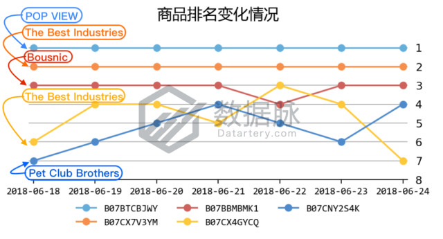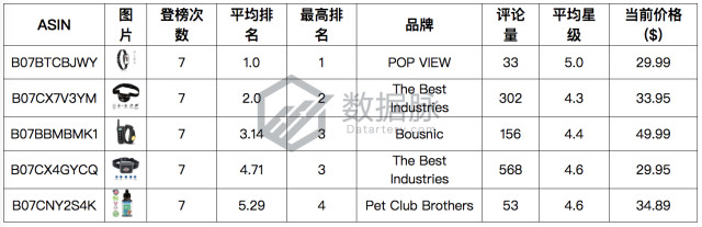 同时,两款来自品牌The Best Industries的防吠项圈也发挥稳定,这两款内置新版智能芯片、拥有7种可调节模式的产品在7天中分别取得了2.00与4.71的榜单排名,分别位列综合排名的第二、四位;