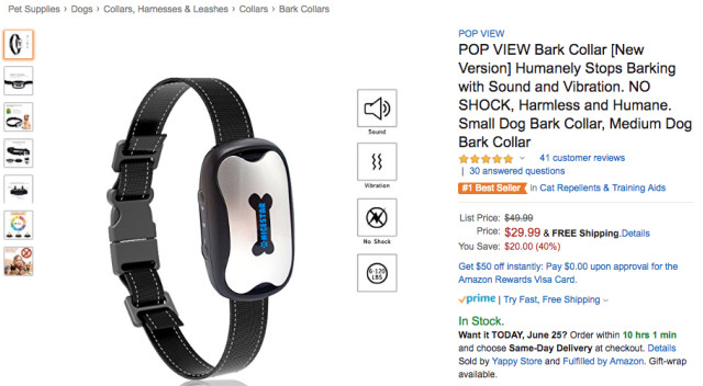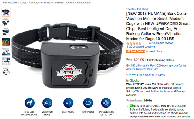 可以看到,在上周Pet Supplies品类的Hot New Releases榜单中, 骆探长(shujumai.com)注意到,四款2018新版宠物狗训练项圈类产品发挥出众,一举占领了商品综合排前四——其中,来自品牌POP VIEW的中小型犬防吠项圈产品在7天中成功蝉联了Hot New Releases榜单首位,以评论平均星级5.0的完美口碑位列商品综合排名首位,目前该商品上架时间尚不满三个月,仅拥有33条消费者评论,后续市场潜力值得关注;