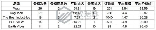 2018年6月18日至2018年6月24日共有423款商品登榜亚马逊Pet Supplies品类的相关榜单,其中涉及品牌数188个。截至2018年6月24日,登榜商品总评论数达1561842条,平均星级4.32星。榜单的登榜商品及品牌数量情况如下表所示:
