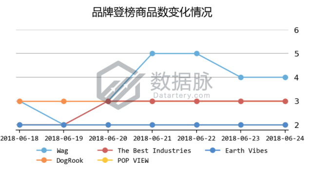 可以看到,在上周Pet Supplies品类的Hot New Releases榜单中, 宠物干粮品牌Wag凭借在6月21日、22日两天中单日上榜5款商品的优秀表现,在一周中完成了26次进榜,成功取得了品牌综合排名第一;与此同时骆探长(shujumai.com)注意到,在品牌综合排名榜单位列二、三、四名的三个品牌——DogRook、The Best Industries与POP VIEW目前皆以宠物狗训练项圈为主营产品,同类型产品在近期的市场热度可能较高,值有关卖家关注。