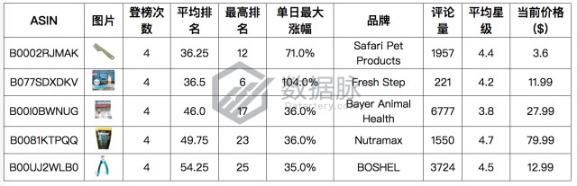 可以看到,在上周Pet Supplies品类的Movers & Shakers榜单中, 商品竞争相对激烈,没有任何一款品牌能够在一周中达成5次以上登榜。而在一周进入榜单4次的商品中,一款品牌为Safari Pet Products的宠物除虫梳产品发挥较为突出,进榜的平均排名达到了相对较高的36.25,以4.4的较好评论平均星级成功跻身综合排名首位。