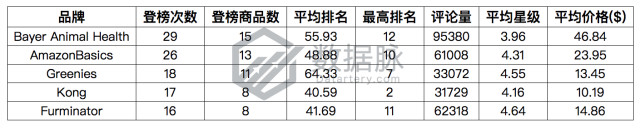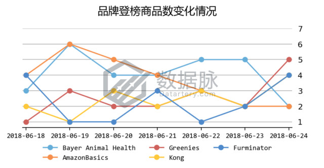 可以看到,在上周Pet Supplies品类的Movers & Shakers榜单中, 宠物卫生用品品牌Bayer Animal Health与亚马逊自营品牌AmazonBasics依旧保持着稳定的榜单发挥,分别在一周中获得29次与26次进榜次数,位居品牌综合排名前二。此外骆探长(shujumai.com)注意到,宠物玩具巨头KONG也在上周中完成了17次进榜,而品牌登榜商品的平均排名达到了40.59,是登榜表现前五的品牌中最高的,宠物玩具是否将成为美亚宠物市场在接下来一段时间中的新热点,同样值得我们关注。