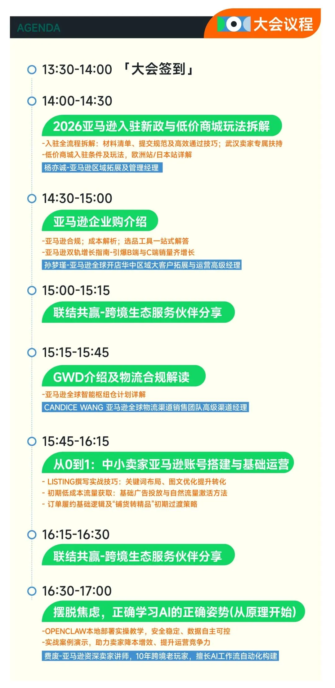 当性价比成为主旋律之一,信息差就是利润差,为了帮助卖家抢占先机,AMZ123联合亚马逊全球开店将于3月27日在武汉襄投万豪酒店3F大宴会厅举办「链动春耕·新启全球 亚马逊全球开店2026春耕大会」,旨在帮助卖家破解“转型无路径、运营缺方法”的核心痛点,通过解读最新招商政策、拆解低价商城玩法、布局智能物流网络,让工厂型卖家与中小卖家找到2026年跨境增长的新锚点,真正实现“链动全球,春耕秋收”。
