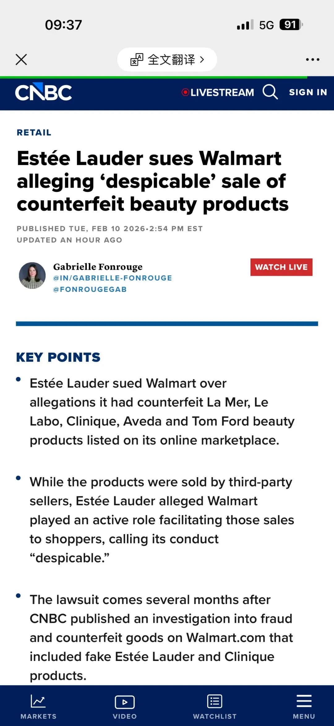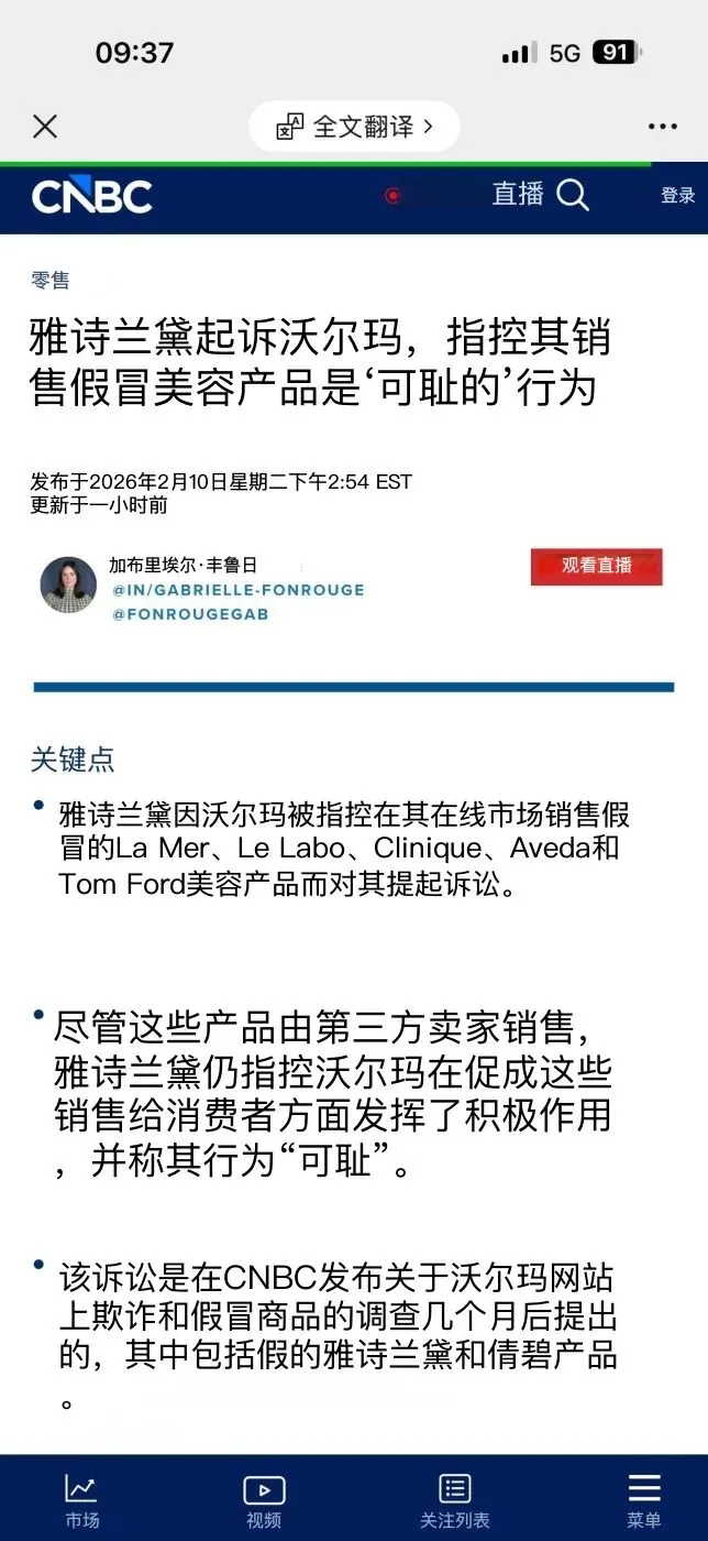 CNBC:雅诗兰黛起诉沃尔玛,揭开平台售假遮羞布