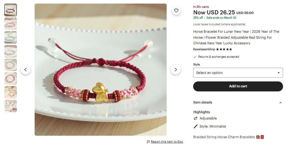 这位卖家在国外社交平台发现海外对生肖饰品的需求后,迅速在etsy平台开通了一家店铺,主打生肖马红绳手链,短短 1 个月就实现月销 223 单,成为平台上的 “生肖爆款卖家”。