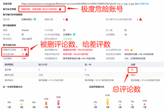 以上图为例,这是一个极度危险的买家,他总共给了48个评论,其中亚马逊删了5条、还给了13个差评,有专门给差评的嫌疑;在亚马逊后台的数据系统中,这个就是一个有问题的买家账号。