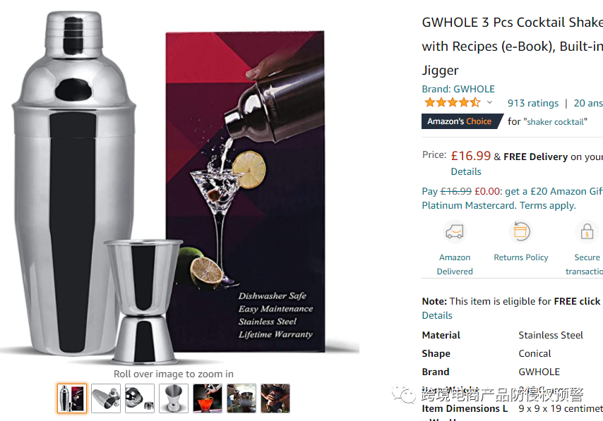 就是下面这款调酒器,目前是亚马逊英国站的Amazon's Choice,现有留评数913,售价16.99英镑:
