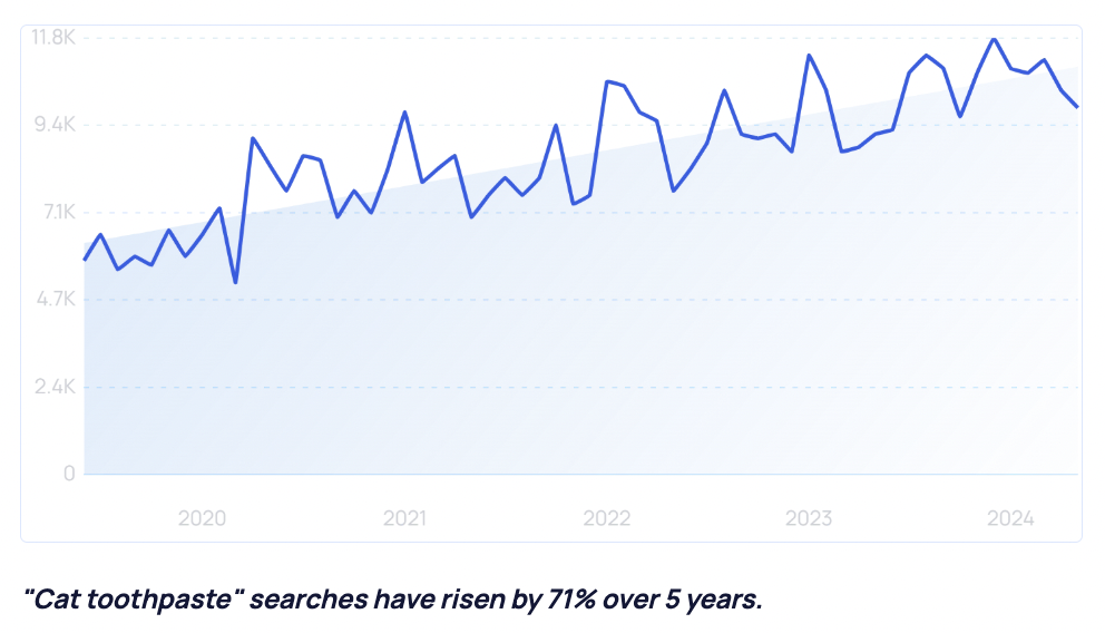 另一增长迅速的品类是宠物牙膏,过去五年“猫牙膏”搜索量增长71%,宠物口腔卫生产品也逐渐多样化,以满足宠物主人对宠物口腔健康的关注。