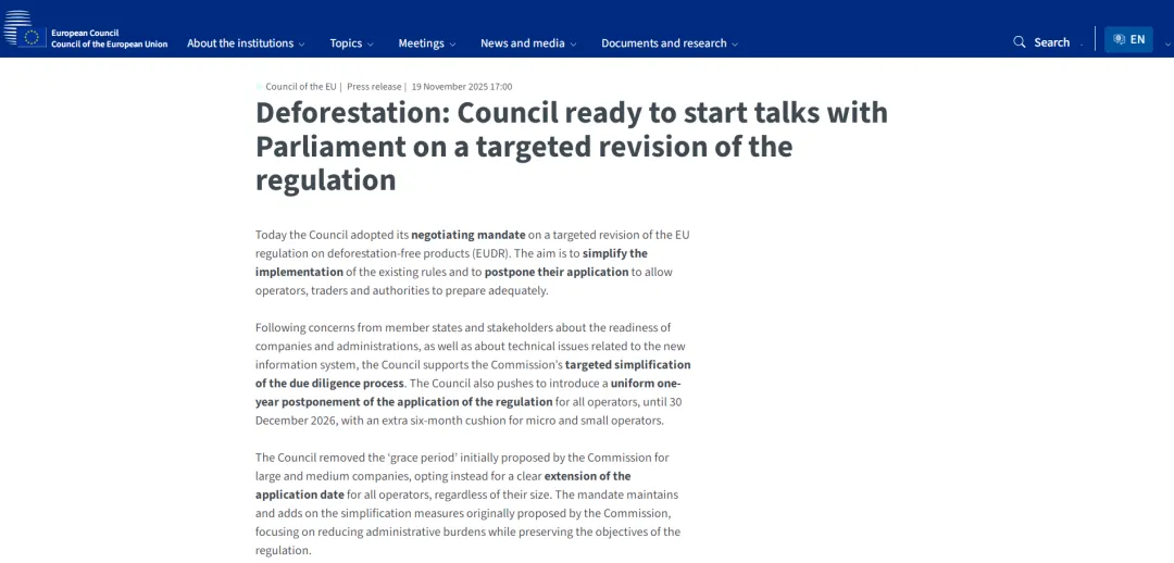 根据该授权,理事会将与欧洲议会展开谈判,力争在未来几周达成最终协议,以便在现行EUDR于2025年12月30日生效之前完成。