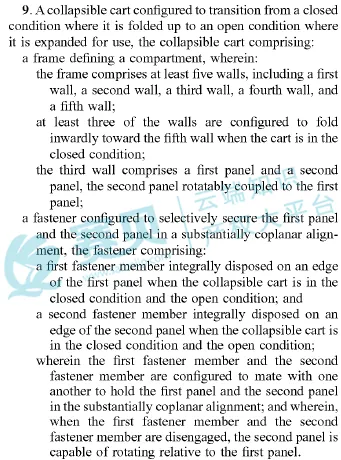 在1的基础上,独权9明确了壁的编号,5个壁具体为:第一、二、三、四、五壁。至少3个壁朝向第五壁向内折叠。第三壁分为第一、第二面板,可旋转连接。第一、第二紧固件一体成型(integrally disposed)在面板边缘。