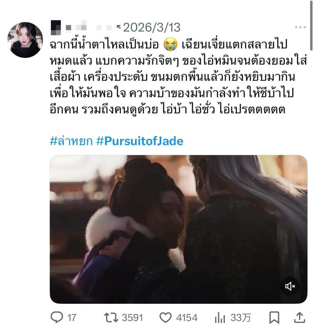 这次的《逐玉》,更是在海外的所有主流社交媒体“处处回响”。在X上,一条《逐玉》里张凌赫田曦薇吻戏的帖子,浏览量甚至高达近百万。TikTok上,“中剧里有种东西,是我们在韩剧里体会不到的”这条评论,获得了超过六千人的点赞。