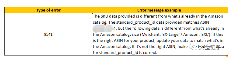 此错误通常称为“单个匹配错误”:如果您的商品编码(UPC、EAN、JAN、ISBN 等)与现有 ASIN 的商品编码相符,但您提交的部分信息与该特定 ASIN 已有的商品信息(商品名称、品牌、颜色、尺寸等)不一致,就会出现此错误。