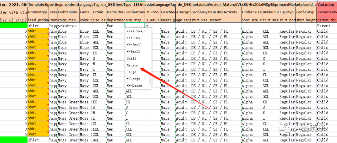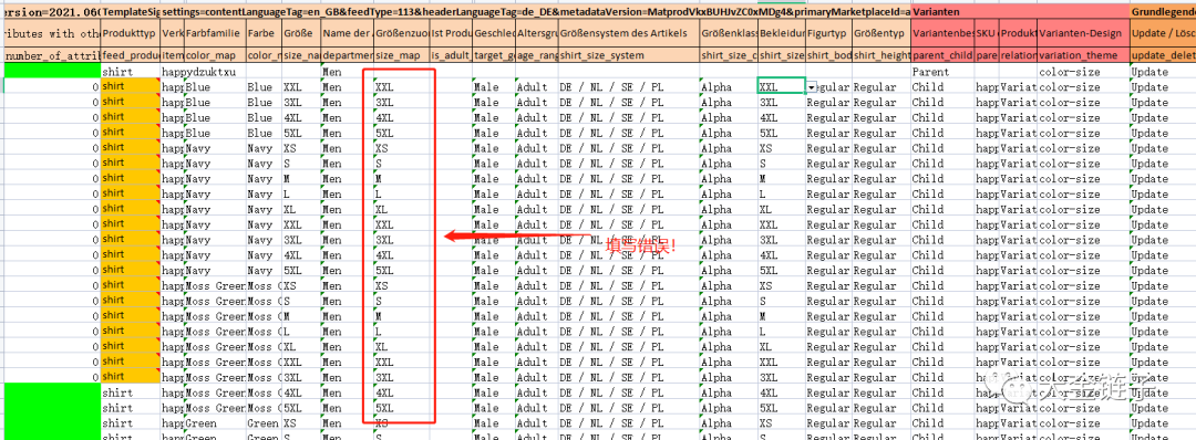 UK上传填写的是X-Large,而DE上传的是XL尺寸,最终导致前后不一致。而恰好DE表格模板和UK上架模板,有些列存在区别。所以这种情况需要上传得到反馈以后再修改再上传。
