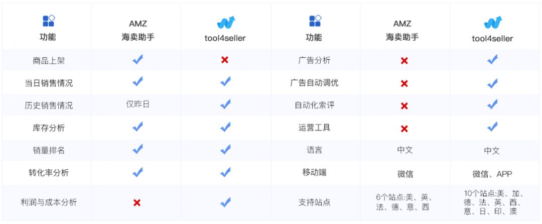 其次在功能方面,tool4seller在店铺数据分析方面相比海卖助手功能更加完善!以下是tool4seller与海卖助手的功能对比:
