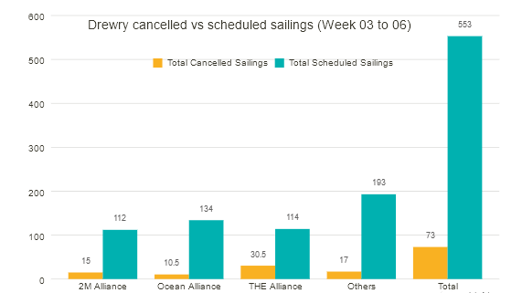 根据德鲁里最新发布的航次取消跟踪报告,在跨太平洋、跨大西洋和亚洲-北欧和地中海等主要航线的553次定期航班中,在第3周至第6周期间,有73次航班被取消,取消率为13%。