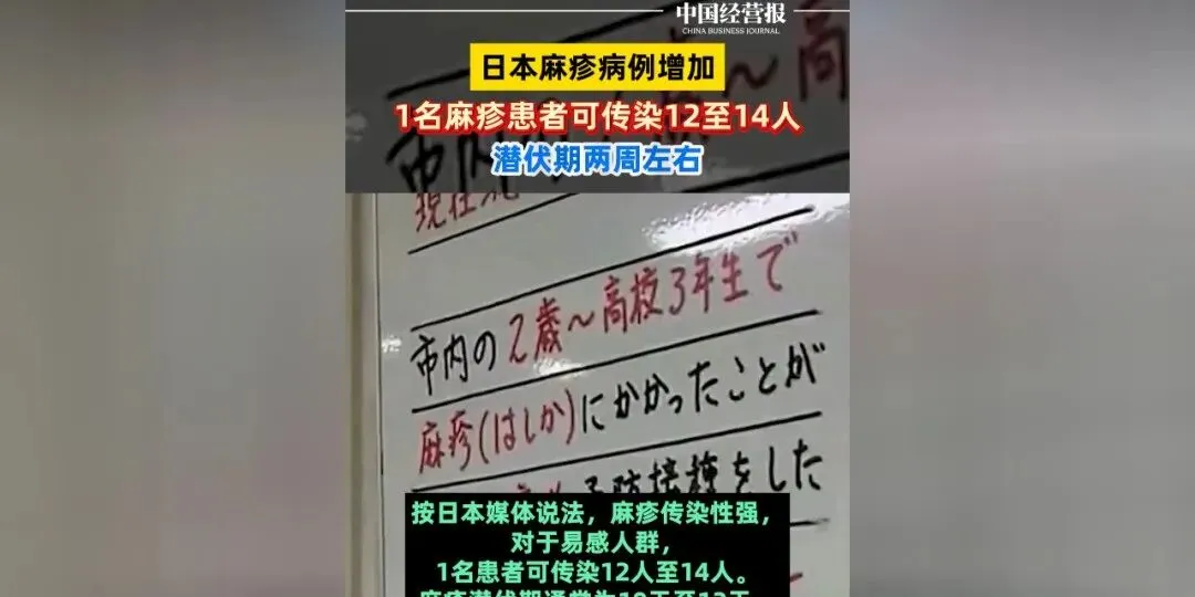 据日本媒体报道,麻疹传染性极强,易感人群中1 名患者可传染 12—14 人。麻疹潜伏期一般为 10 至 12 天,最长可达 21 天,主要症状包括发热、上呼吸道炎症、咳嗽、结膜炎等,重症情况下可能引发肺炎等并发症。