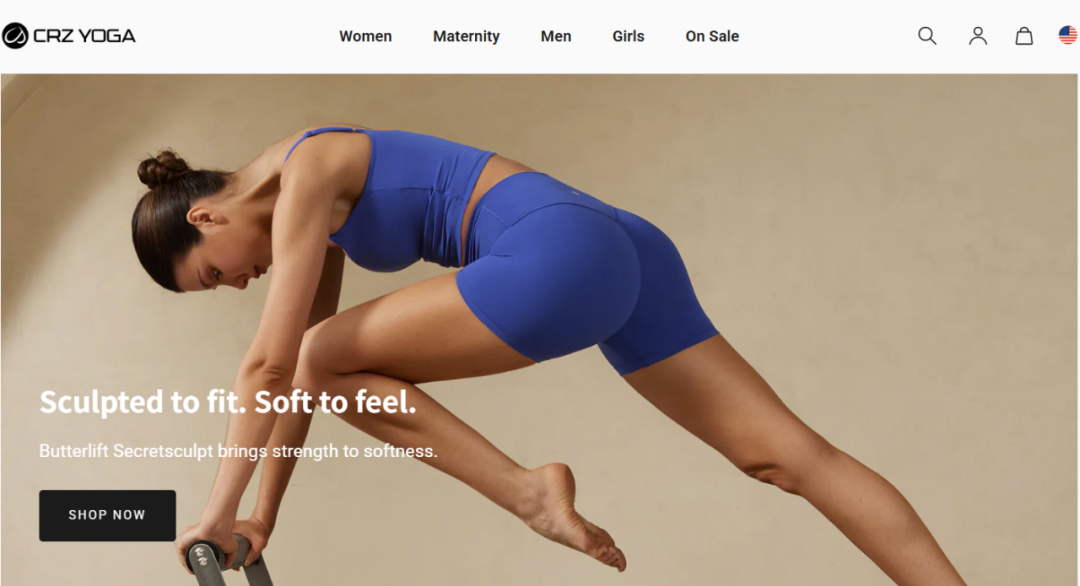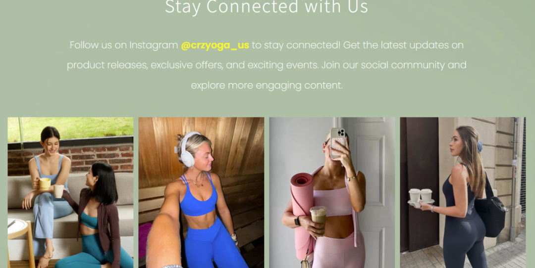 依靠代加工的经验,CRZ YOGA深知品牌化的重要性,搭建自主品牌独立站,通过生活化与场景化的风格,简单明了展示产品,从视觉上吸引用户留存。