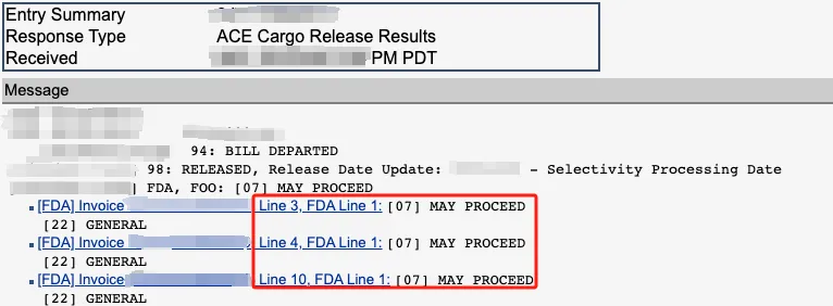 报关 Entry 处理流程(Entry process)始于 FDA 对申报 Entry 所需数据的筛查(Screening)。FDA 完成对所需数据筛查后,将继续进行进口处置程序(Import Disposition),并确定行动通知 NOA(Notice of action)。行动通知类型包括放行产品(Release the product)、要求提供补充信息(Request additional information)、要求提供样品进行评估(Request a sample for evaluation)或要求扣留入境产品(Request detention of the entry)。FDA 生成(Generates)进口处置决定(Import disposition)确定行动通知后,将向美国海关 CBP 及海关备案进口商 IOR(Importer of Record)发出通知,CBP 会根据需要将信息发送给报关行和其他相关方。