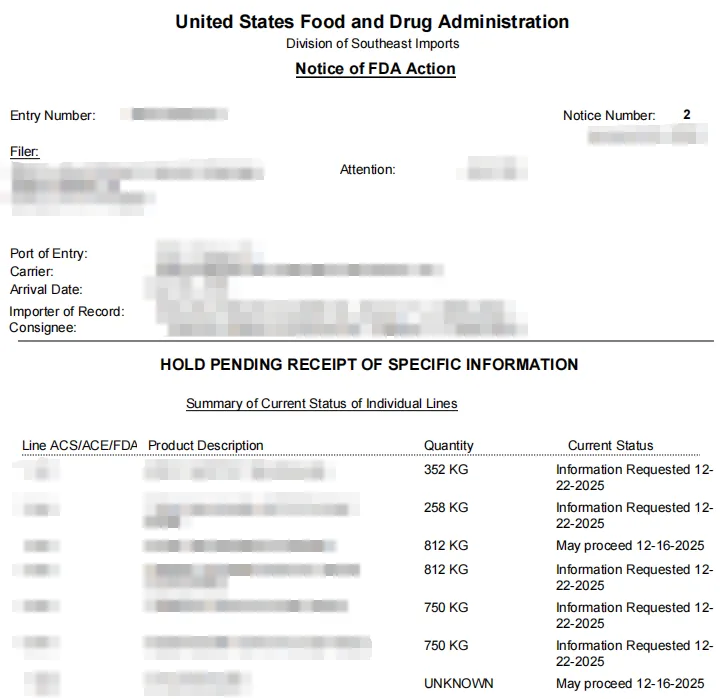 在 FDA 发出要求提供补充信息的行动通知后,若进口商未能提供所要求的信息可能导致 FDA 发出扣留(Detention)行动通知或 FDA 采取其他适当行动。