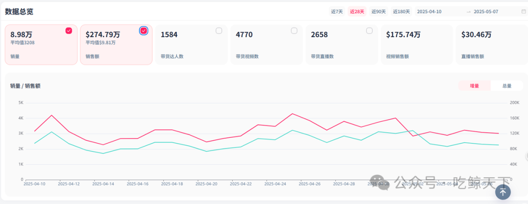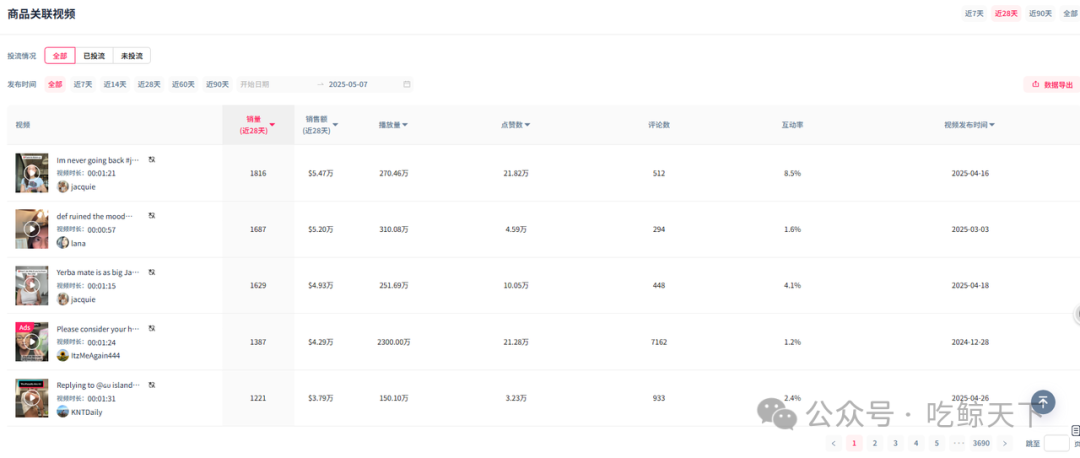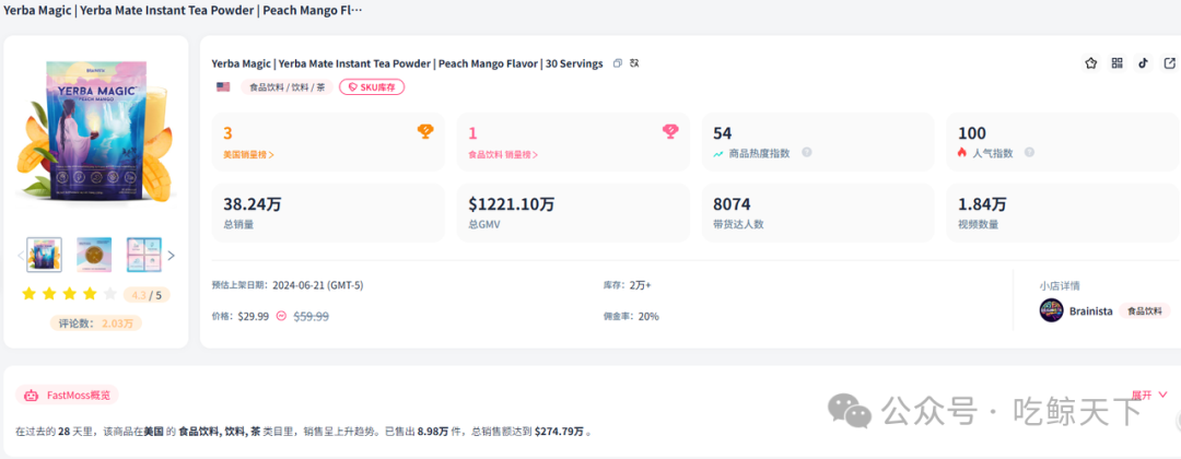 根据EchoTik数据显示,这款蜜桃芒果风味的马黛茶速溶茶粉在过去的30天里销量达95.1K件,预计销售额高达 3.5M。不仅如此,这款茶粉已经有了 2.3K 位带货达人进行带货推广,并且有 8.3K 个相关的带货视频,并进行了 811 次直播。这一系列数据充分展示了该商品的市场潜力和受欢迎程度。