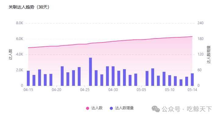 近30天,其关联达人数仍呈现上升趋势。这个品牌战术之一是重视建立小达人矩阵,庞大的小达人形成一股合力,在社交媒体上掀起一股浪潮,吸引用户的注意力。