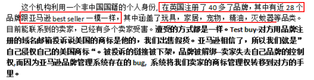 根据卖家爆料描述,操纵本次事件的机构利用一个非中国国籍的个人身份,在英国注册了40多个品牌,其中有28个品牌跟亚马逊Best Seller的一模一样,涵盖类目包括玩具、家居、宠物、精油、灭火器等多个品类。