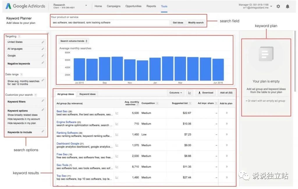 Google Keywords planner 只有你使用了 Google Ads(以前是 Google Adwords)你才可以使用。是 Google 的官方关键词工具。外界的关键词工具数据来源基本都是来自于 Google Keywords planner 的数据。