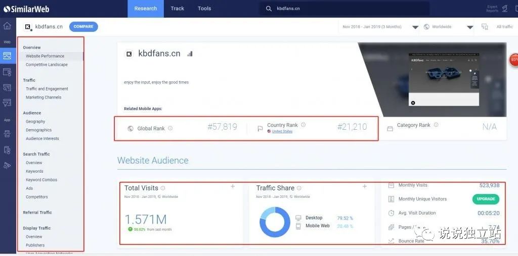 Similweb 做的越来越好了,Techcrunch 的网站排名数据接口就是用的 Similarweb. 网站排名/ 地域分析/流量来源及细分,相信每一个做竞争对手分析都会来这里看一看的。