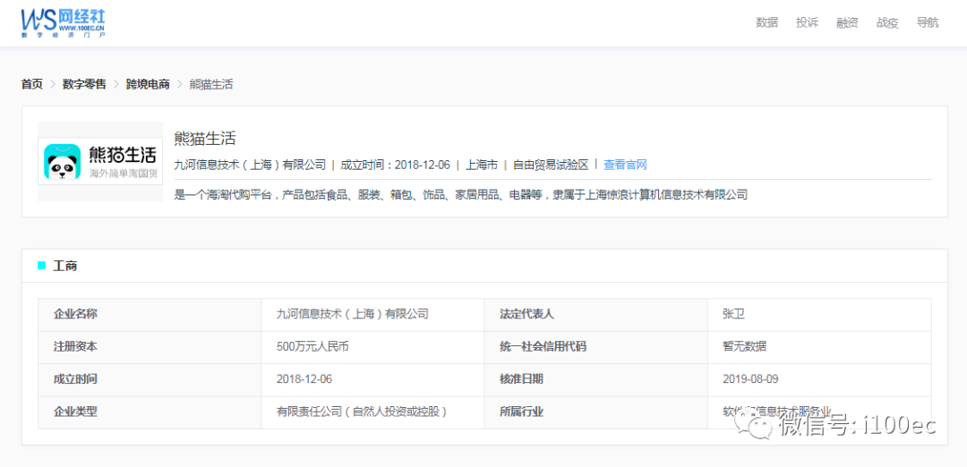 据网经社企业库(COP.100EC.CN)了解,熊猫生活隶属于九河信息技术(上海)有限公司,该公司成立于2018年12月6日,法定代表人为均为张卫。自称平台拥有代购行业经验,主要提供一站式淘宝服务(信用卡支付、验货、仓储等)。