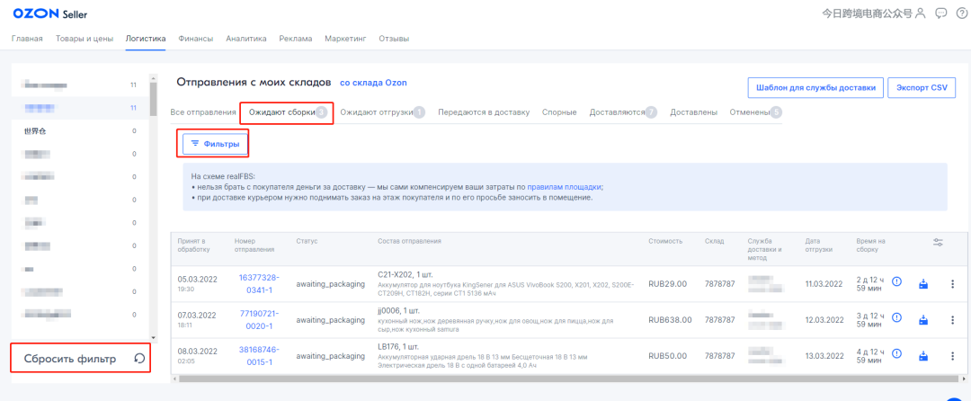 当OZON官方人员在仓库收集点找不到货件时,就会显示该状态。产品发货当天直接移到FBS菜单栏→我的仓库中的订单→有争议的。