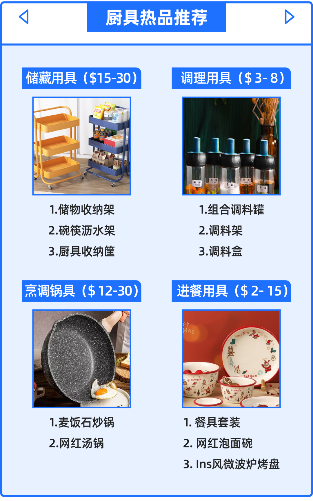 调料用具方面与国内消费趋势相似,免打孔、方便安装的调料架搜索更多。