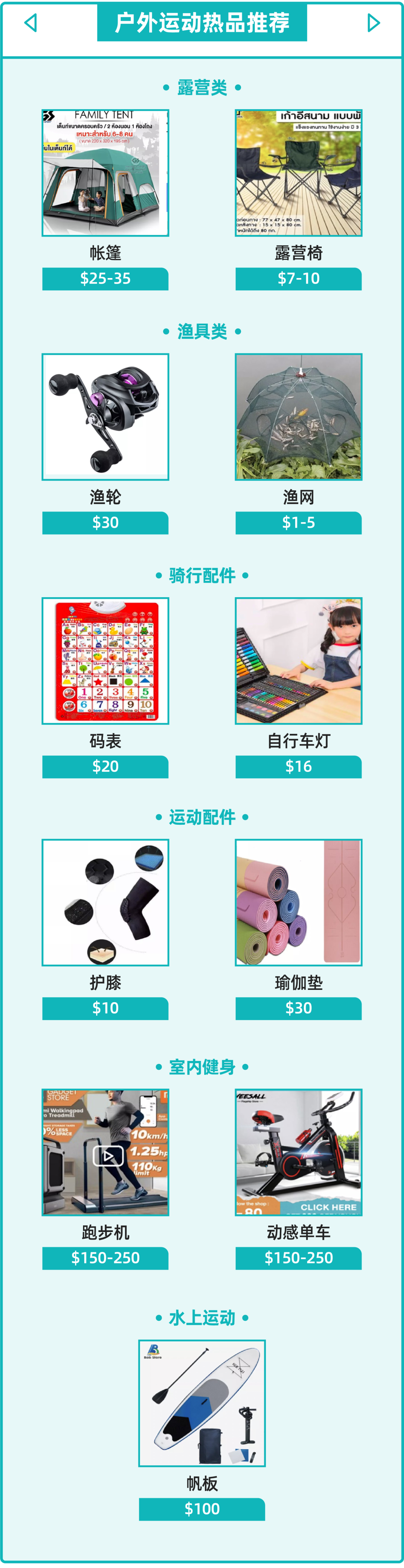 疫情缓和后,东南亚的骑行需求也同步升高。结合露营需求,折叠自行车成为多国热销商品。在骑行类目中,高销量商品是骑行配件,骑行灯、零件、骑行眼镜、运动水瓶等,商家可结合活动打造爆品引流。