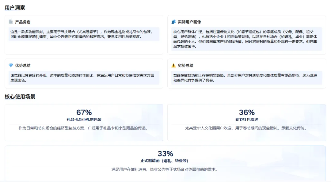 【机会点】 竞品因为过度聚焦节日,白白丢掉了这67%的通用市场。我们的策略很明确:开发一款去生肖化、去年份化的“常青款”红色烫金信封,主打婚礼、商务送礼场景,把生意做成全年的流水。